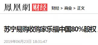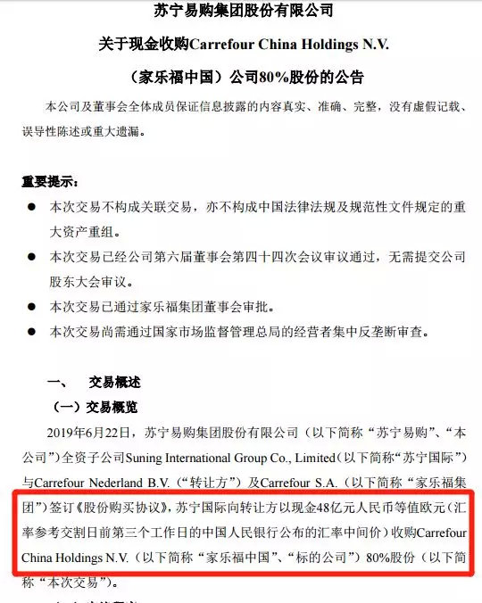 6月23日下午,苏宁易购公告称,苏宁易购全资子公司苏宁国际与家乐福集团达成协议,拟48亿元收购家乐福中国80%股份。