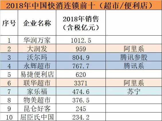 至此,中国快消连锁前十中,阿里、腾讯、苏宁深度合作/入股超过一半!