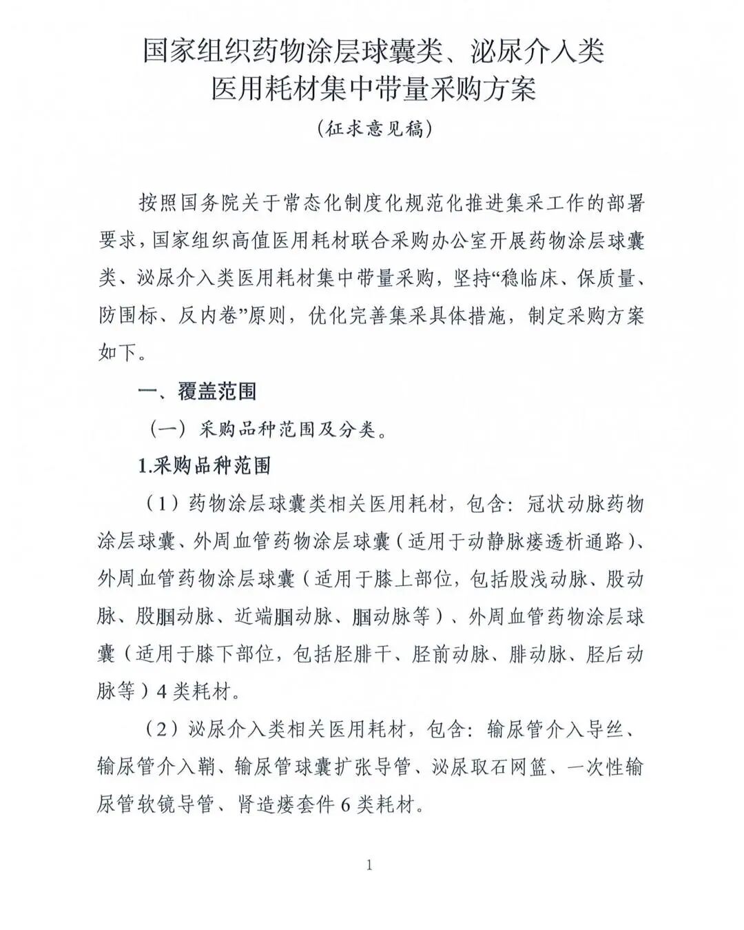 今年8月1日,国家组织高值医用耗材联合采购办公室(简称“联采办”)发布通知,宣布开展药物涂层球囊类及泌尿介入类医用耗材的产品信息集中维护工作(《关于开展药物涂层球囊类及泌尿介入类医用耗材产品信息集中维护工作的通知》,简称《通知》),标志着本轮集采的正式启动。