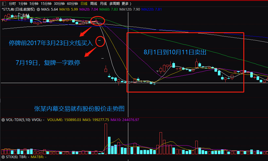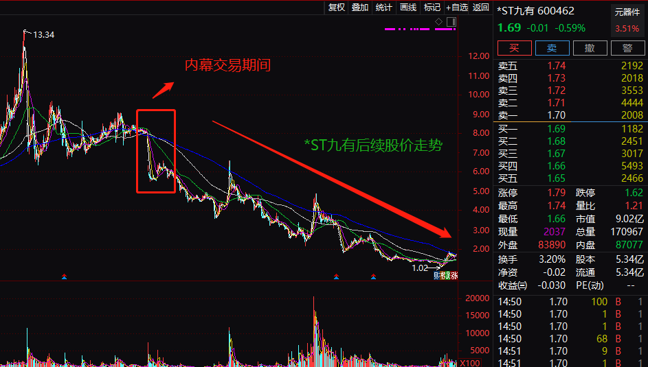内幕交易的张某若是当时没有卖出,持有至今损失将会更加惨重。张某买入价为8元左右,卖出价在6元附近,而后九有股份变身为*ST九有,股价也一路暴跌,最低至1.02元,如今最新股价也只有1.69元。