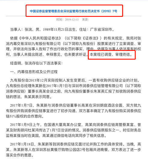 中国证监会官网近日一份行政处罚书显示,深圳证监局局对张某内幕交易九有股份股票案进行了立案调查、审理,本案现已调查、审理终结。