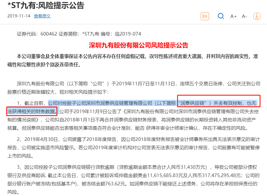 *ST九有近期表示,截止目前,公司对控股子公司润泰供应链失去有效控制,也无法获得相关的财务数据。并且因润泰供应链银行贷款逾期(贷款逾期金额本息合计人民币31,430万元),导致公司被部分债权银行及供应商起诉。