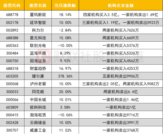 卖出方面,泸州老窖遭机构卖出2.05亿;同花顺遭机构卖出6.4亿;中国长城遭机构卖出1.46亿。