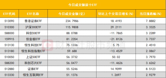 从成交额前十的ETF来看,香港证券ETF(513090)成交额位居首位;沪深300ETF510300)成交额位居第二位。