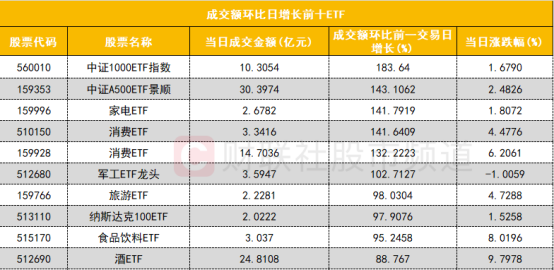 从成交额环比增长前十的ETF来看,中证1000ETF指数(560010)成交额环比增长183%位居首位;多个消费细分行业ETF位居前十行列,其中家电ETF(159996)成交额环比增长141%位居第三位。