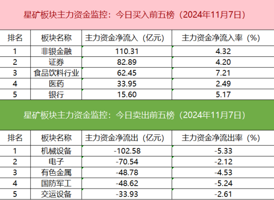 板块资金流出方面,机械设备板块主力资金净流出居首,净流出超百亿。