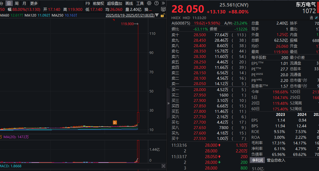 港股东方电气盘中一度暴涨超过700%