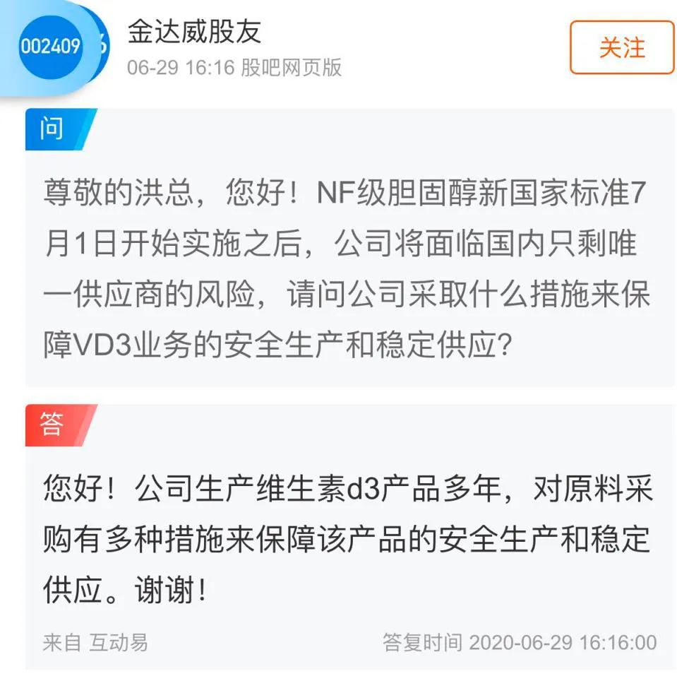 日前,有投资者在互动平台上向金达威提问:NF级胆固醇新国家标准实施后,公司将面临国内只剩唯一供应商的风险,请问公司采取什么措施保障维生素D3业务的安全生产和稳定供应?