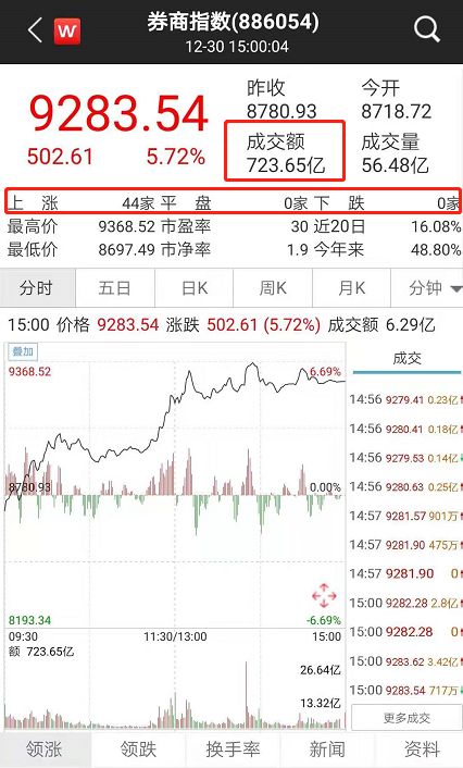 截至收盘,券商指数整体涨幅超5.72%,指数报收9283.54。短短一日,高达2.78万亿板块市值暴增1500多亿,巨量资金抢筹券商股标的。