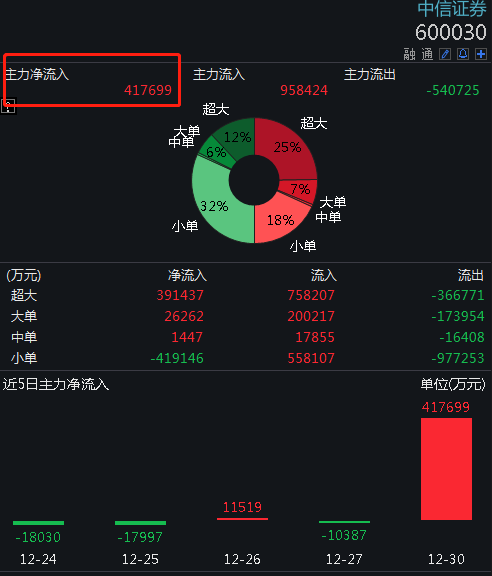 龙头股中信证券出现强势涨停态势,成交额超100亿。截至收盘,中信证券涨停,报收25.66元,总市值接近2900亿元。从资金流向看,当日中信证券主力净流入超41亿元,其中超大单净流入超39亿元,巨量资金抢筹券商股龙头迹象明显。