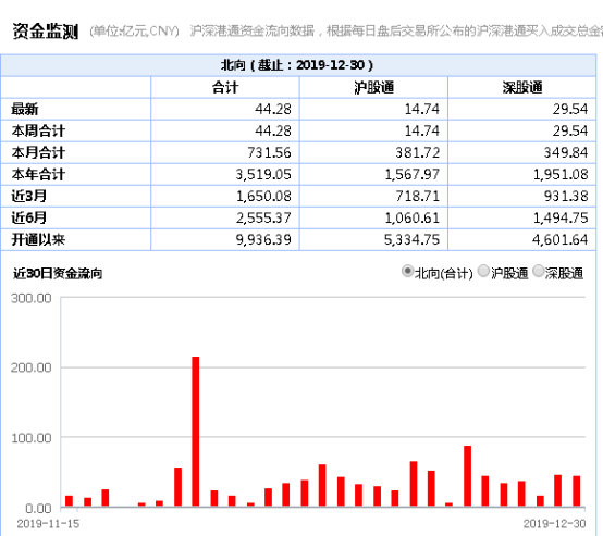 截至12月30日,北上资金已经连续多日持续净买入,今日最新净流入资金超44亿。今年以来,北上资金买入规模已经超出3500亿大关。