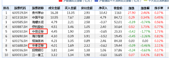 从北上资金活跃买入的个股看,其资金布局方向也从原本的银行、消费等蓝筹股转为科技、券商等方向个股。从最新公布的北上资金十大活跃个股股列表看,近期北上资金对龙头股中信证券、华泰证券的成交金额均超4亿,换手率也接近2%。