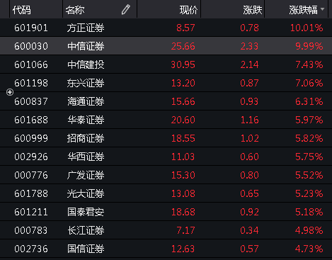 而从板块看,截至收盘,36家上市券商全线飘红,其中方正证券、中信证券涨停,中信建投、东兴证券、海通证券涨幅超6%以上。多只个股振幅超10%以上,场内资金交投活跃。