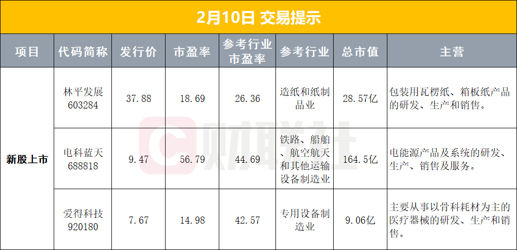 2、沪深北交易所2月9日宣布优化再融资一揽子措施。在进一步支持优质上市公司创新发展方面,沪深北交易所明确,对经营治理与信息披露规范,具有代表性与市场认可度的优质上市公司,优化再融资审核,进一步提高再融资效率。同时,为更好适应科创企业再融资需求,沪深交易所已修订上市公司“轻资产、高研发投入”规则,明确主板企业认定标准。