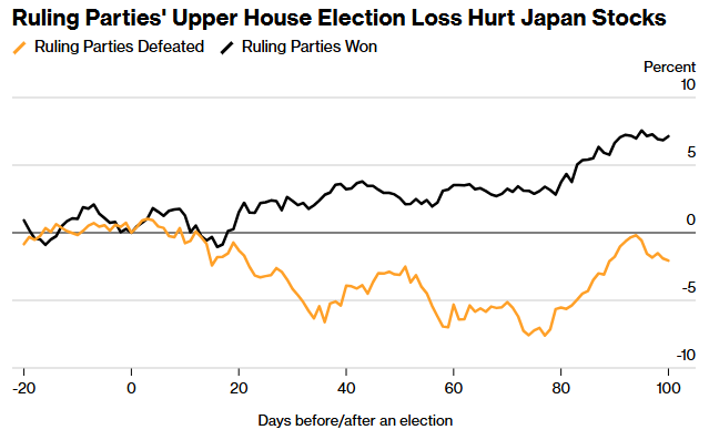 日兴资产管理公司的首席分析师Toshiya Matsunami表示,当执政党失去多数席位时,“市场需要 35 至 75 天才能触底,这一期间的总跌幅平均约为 8%”。而如果执政党获胜,东证指数则大约在 15 天内触底。