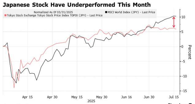 如果根据选前民调的预测来看,那么在本周日的日本参议院选举之后,日本股市可能会出现持续下跌的局面。多项地方选举结果显示,执政联盟可能在本周末的选举中失去多数席位,这给首相石破茂带来了又一个打击,此前他在去年 10 月的下议院选举中意外失去了多数席位。政治方面的担忧已经对市场造成影响,当地股票的表现也逊于MSCI世界指数本月的走势。