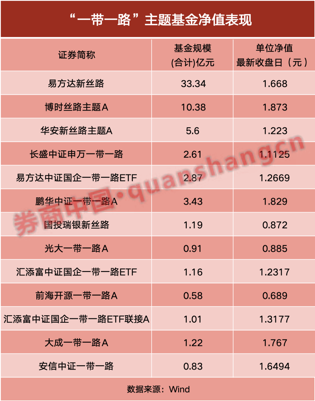 Wind数据显示,易方达、富国、博时等多家基金公司早已布局了“一带一路”基金产品,加上联接基金,全市场共有25只“一带一路”主题基金(A/C份额分开计算)。其中规模最大的是易方达新丝路33.34亿元,今年一季度低点以来上涨12.47%,最新净值1.6680;博时丝路主题A规模10.38亿元,一季度低点以来上涨18.17%,最新净值1.8730。