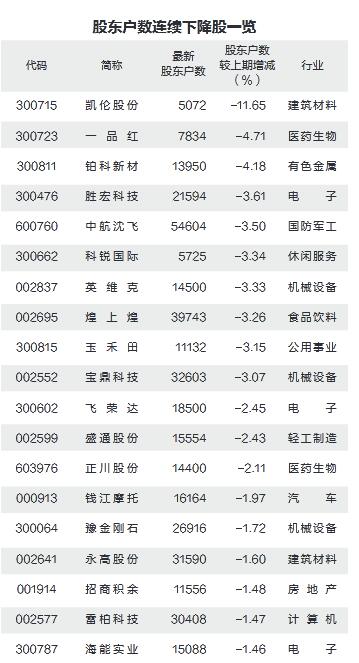 从最新一期的股东户数下降幅度看,降幅较大的有凯伦股份、一品红、铂科新材等,最新股东户数分别下降11.65%、4.71%、4.18%。