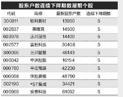股东户数连续下降个股中,连降时间较长的有英维克、铂科新材等。其中,英维克最新股东户数为14500户,已连续减少5期,累计降幅为33.18%;铂科新材股东户数连降5期,最新户数为13950户,累计降幅18.19%;股东户数连降期数较多的还有三川智慧、正川股份、雷柏科技等。