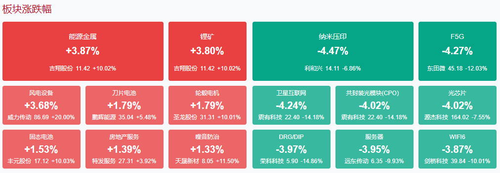 盘面上,新能源赛道股展开反弹,其中锂矿股领涨,江特电机、吉翔股份均2连板;电网概念股集体走强,中恒电气、白云电器等涨停;风电股盘中冲高,大金重工涨停,双一科技涨超10%。地产股盘中拉升,金科股份、荣盛发展涨停。券商股继续活跃,锦龙股份涨停。下跌方面,半导体板块集体调整,光刻机方向领跌,张江高科跌停。高位股继续大跌,好上好、上海沪工、双鹭药业等跌停。板块方面,锂矿、房地产、证券、电力设备等板块涨幅居前,光刻机、CPO、存储芯片、卫星导航等板块跌幅居前。