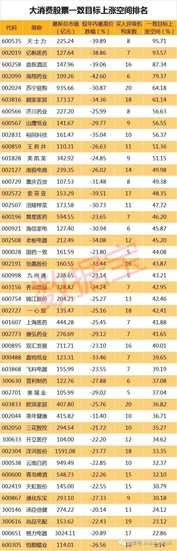 消费白马股跌幅排名,谁被错杀,这些股被机构一致看好,最高目标涨幅超九成(名单)