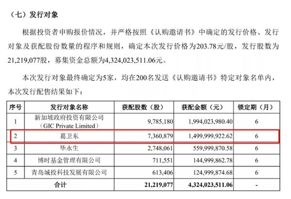 6月4日晚,兆易创新披露非公开发行股票发行结果,兆易创新以203.78元/股价格,向新加坡政府投资有限公司(GIC)、葛卫东、毕永生、博时基金、青岛城投科技发展有限公司非公开发行2121.91万股股份,募集资金总额达43.24亿元。本次发行对象所认购的股份锁定期为 6 个月。