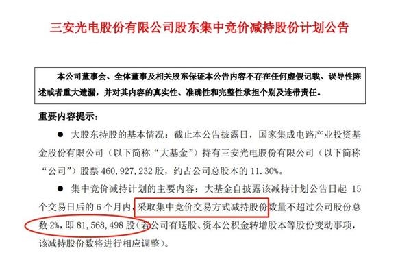 美股突发暴跌,A股周五独自走稳,然而周五晚间突发大基金减持消息。国家集成电路产业投资基金股份有限公司(以下简称“大基金”)拟减持三安光电、兆易创新,最多分别减持19.4亿元、10.83亿元。