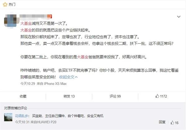 对于大基金(又称为大基金一期)的减持行为,有微博网友认为不用过于担忧,这不是大基金第一次减持,并且大基金的目的是把行业和公司“扶起来”,目前把公司扶起来了减持,去扶持新的公司,也是很正常的。