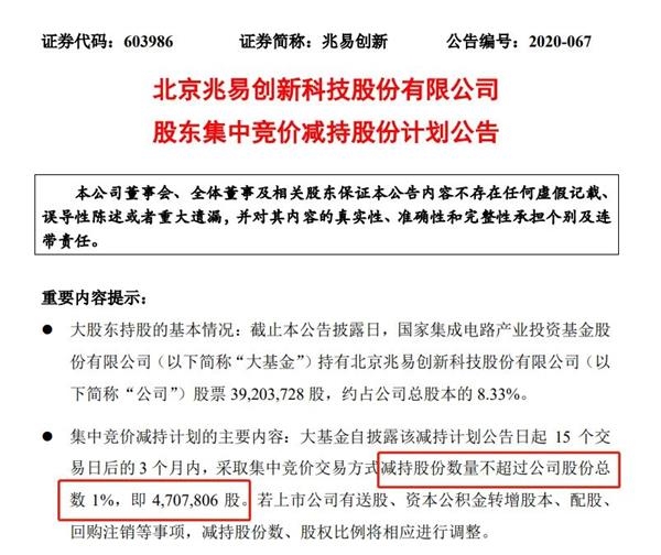 此前遭大基金减持的兆易创新再度公告,6月12日晚间公告,大基金(持股3920.37万股,持股比例8.33%)自披露该减持计划公告日起15个交易日后的3个月内,采取集中竞价交易方式减持股份数量不超过公司股份总数1%,即471万股。兆易创新最新股价为230.03元,对应的拟减持金额不超过10.83亿元。
