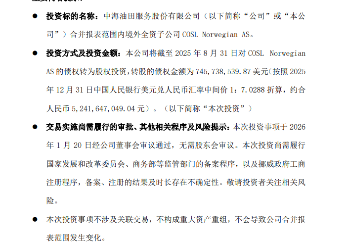 中海油田服务涨幅居前。该公司公布重大资本运作:公司拟将截至2025年8月31日对全资子公司COSL Norwegian AS的7.46亿美元债权(约合人民币52.42亿元)转为股权投资。交易完成后,中海油服与下属子公司CSL将分别持有COSL Norwegian AS 83.02%和16.98%的股权。