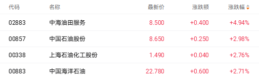 港股石油股周四表现强劲。截至发稿,中海油田服务(02883.HK)涨4.94%、延长石油国际(00346.HK)涨2.98%、中国海洋石油(00883.HK)涨2.71%。