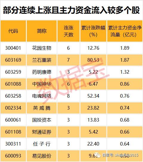值得注意的是,80只连续上涨个股中,3只个股期间主力资金累计净流入超过亿元。其中,累计资金流入最多的为花园生物,主力资金累计流入1.89亿元。