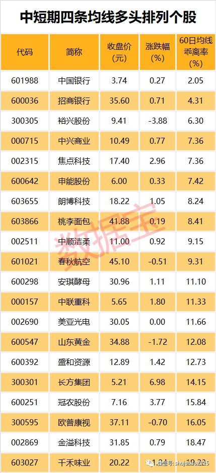 一般来说,均线多头排列代表买方力量强大,后市由多方主导行情概率较大。截至6月17日,27只个股5日、10日、20日、60日四条均线近日呈多头排列。其中中国银行、招商银行、裕兴股份股价与60日均线的乖离率最小,分别为2.05%、4.31%、6.30%。