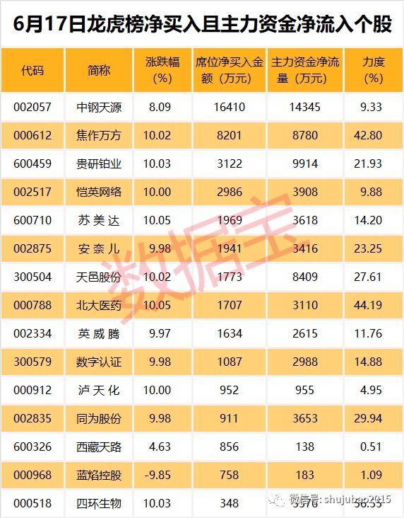 6月17日龙虎榜中机构及营业部席位资金净卖出1.03亿元,其中净买入的个股有21只;净卖出的个股有28只。净买入前三名个股分别是中钢天源、焦作万方、神农科技等,净买入金额占当日成交额比例达10.67%、39.98%、6.33%。