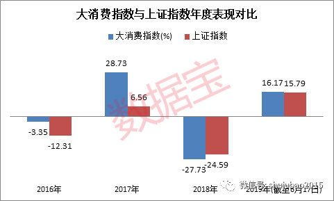 大消费板块的防御性历来都是较强的。数据宝统计显示,自2016年至2019年(截至6月17日),除2018年外,其余三年大消费指数均跑赢同期沪指涨跌幅。尤其是2017年,大消费指数跑赢沪指20个百分点以上,最新数据显示,2019年度大消费指数也小幅跑赢沪指。