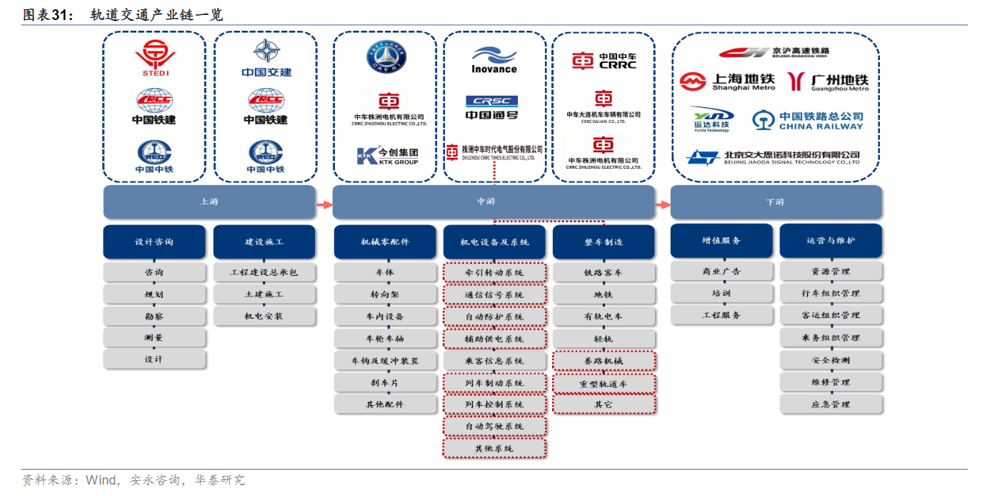 从产业链分布来看,华泰证券黄乐平等人6月16日研报表示,轨交装备制造位于轨道交通产业链中游,其中整车制造为核心,市场份额较高,涉及上市公司包括中国中车等;产业链上游环节是设计咨询和建设施工;下游环节可分为增值服务、轨道交通运营与维护。