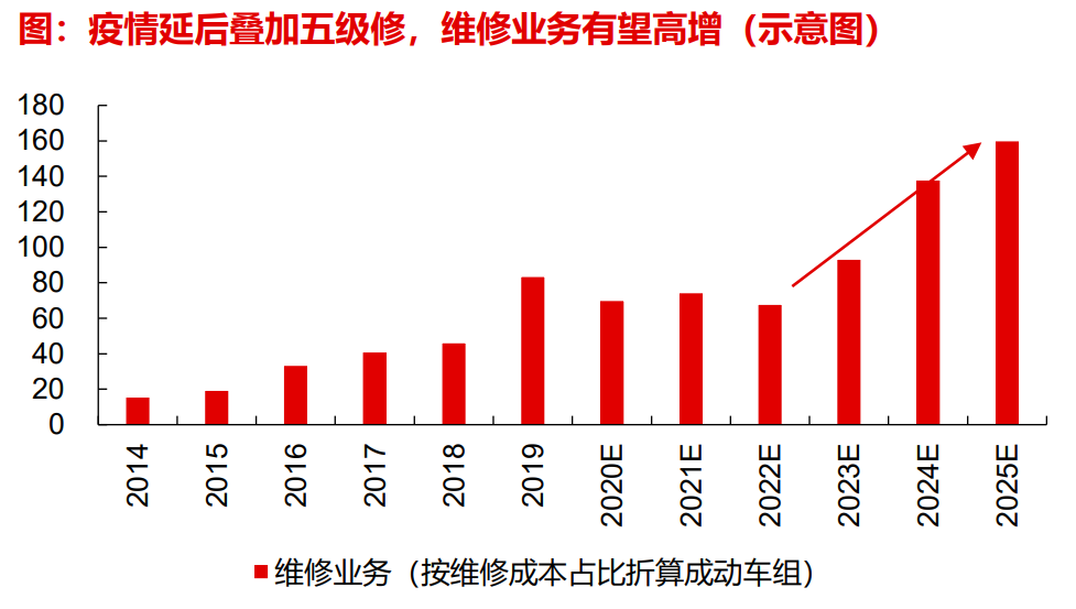 同时,自2019年起动车组逐步进入价值量最高的五级修阶段,但2020-22疫情对维修维保业务造成延后影响,未来维修业务将进入爆发期,预计2022-2025年维修业务年均复合增长率有望达30%以上。