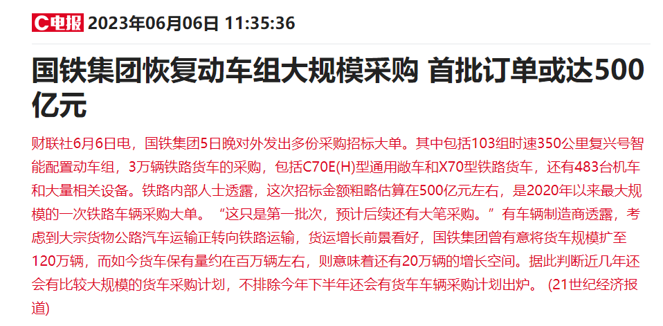 “这只是第一批次,预计后续还有大笔采购。”有车辆制造商透露,考虑到大宗货物公路汽车运输正转向铁路运输,货运增长前景看好,国铁集团曾有意将货车规模扩至120万辆,而如今货车保有量约在百万辆左右,则意味着还有20万辆的增长空间。据此判断近几年还会有比较大规模的货车采购计划,不排除今年下半年还会有货车车辆采购计划出炉。