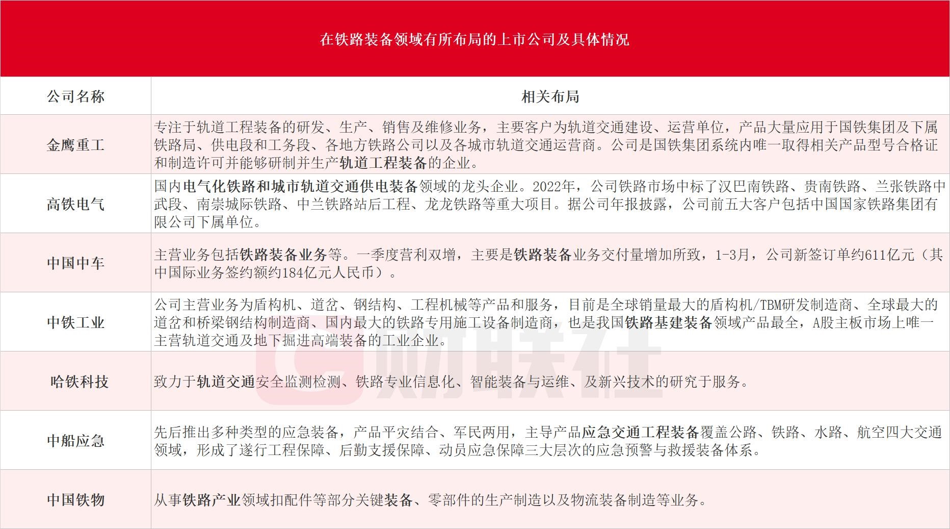 另据财联社不完全统计,涉及铁路装备的A股上市公司包括金鹰重工、高铁电气、中国中车、中铁工业、哈铁科技、中船应急和中国铁物等,具体情况如下: