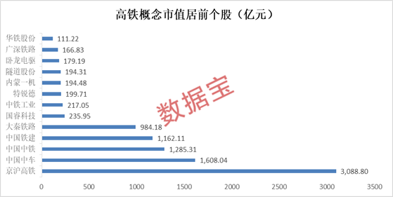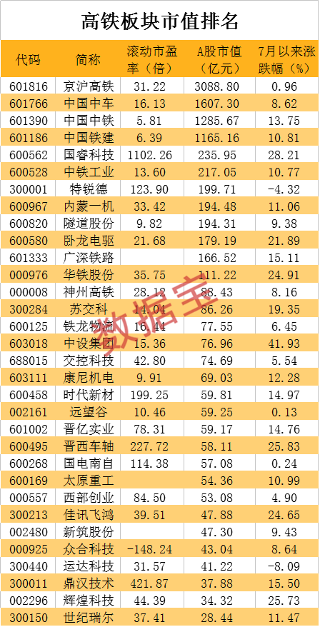 证券时报·数据宝粗略统计,高铁板块市值近1万亿,市值超百亿的有13家,超千亿的有4家,包括京沪高铁、中国中车、中国中铁、中国铁建。京沪高铁最新市值超3000亿,公司运营的京沪高速铁路是世界上建成里程最长、技术标准最高的高速铁路。今日早间,明晟公司(MSCI)在官网宣布8月MSCI股票指数的季度评估及调整结果,将京沪高铁新纳入MSCI中国指数。