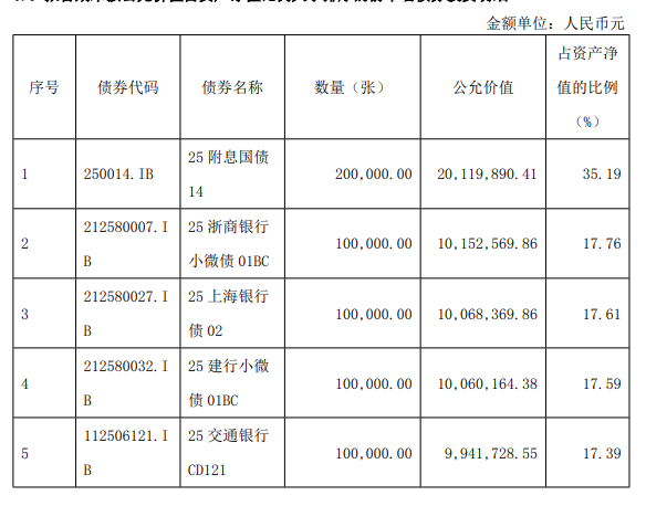 可查资料显示,该产品2025年期末投资组合中,基金投资占比3.32%,主要投资于汇添富和聚宝 C,而该基金1月收益下跌;债券投资占比82.42%,前五大债券明细如下: