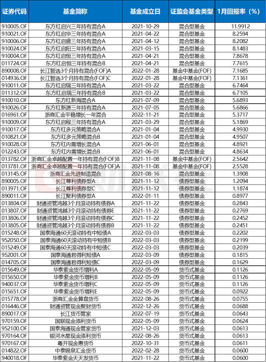 整体来看,46只基金1季度均实现正回报,混合型基金表现最佳,以东方红启兴三年持有混合A(12%)为首,多只东方红系列三年持有期产品回报集中在5%-8%区间,显示在1月股市向好的情况下,其权益投资在当月获取了显著阿尔法。