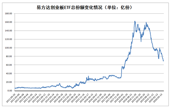 比如易方达创业板ETF份额二季度以来总体持续减少。今年3月底,该基金份额一度再次突破100亿份,但到了4月下旬就跌破90亿份,5月下旬进一步跌破80亿份,如今份额仅在70亿份左右。