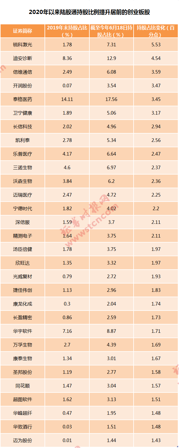 目前陆股通是外资买入A股的最主要通道。Wind数据显示,2020年以来至今,239只创业板陆股通标的中,有185只标的陆股通持股比例出现提升,占比达到77.41%。这意味着年内多数创业板陆股通标的获得北上资金增仓。