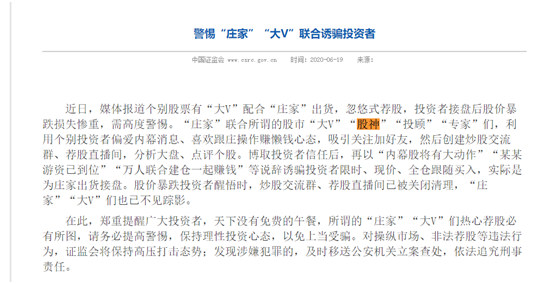不过,证监会网站再次提示相关风险。证监会称,近日,媒体报道个别股票有“大V”配合“庄家”出货,忽悠式荐股,投资者接盘后股价暴跌损失惨重,需高度警惕。“庄家”联合所谓的股市“大V”“股神”“投顾”“专家”们,利用个别投资者偏爱内幕消息、喜欢跟庄操作赚懒钱心态,吸引关注加好友,然后创建炒股交流群、荐股直播间,分析大盘、点评个股。博取投资者信任后,再以“内幕股将有大动作”“某某游资已到位”“万人联合建仓一起赚钱”等说辞诱骗投资者限时、现价、全仓跟随买入,实际是为庄家出货接盘。股价暴跌投资者醒悟时,炒股交流群、荐股直播间已被关闭清理,“庄家”“大V”们也已不见踪影。