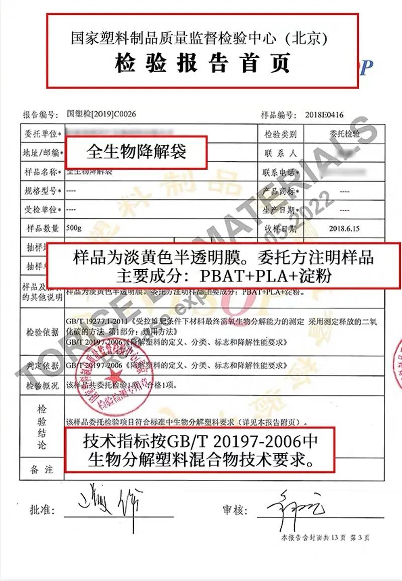 查阅此款垃圾袋的检验报告可以看到,其主要成分为;PBAT、PLA和淀粉。