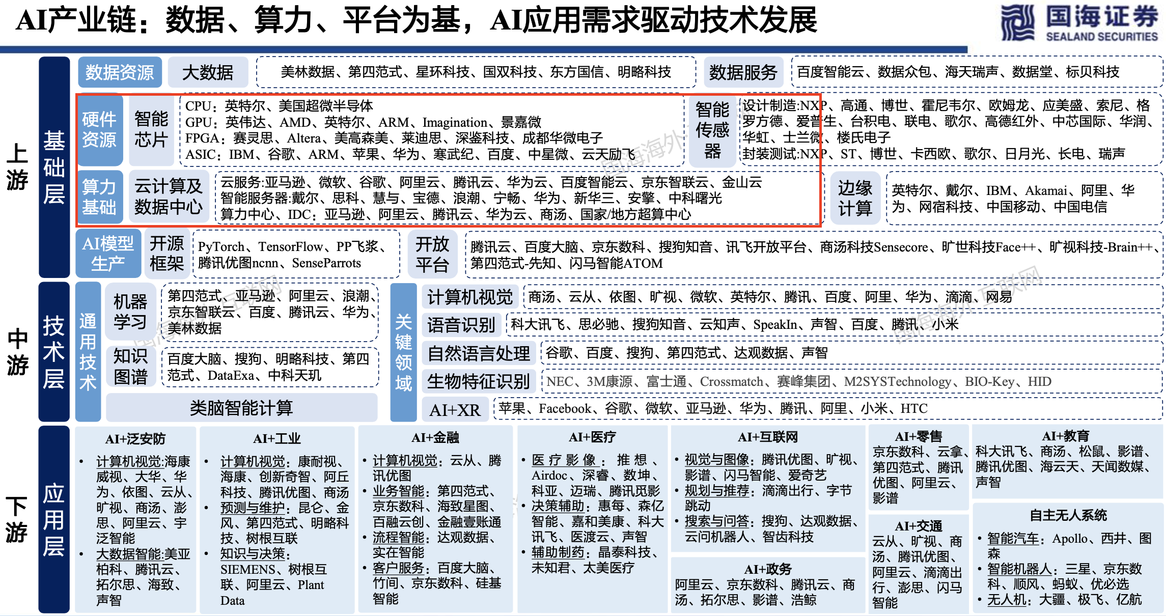 此外,产业链中智算中心为人工智能夯实“算力底座”。根据国家信息中心联合浪潮信息日前发布的《智能计算中心创新发展指南》测算,“十四五”期间,在智算中心实现80%应用水平的情况下,城市对智算中心的投资可带动人工智能核心产业增长2.9至3.4倍,带动相关产业增长36至42倍。