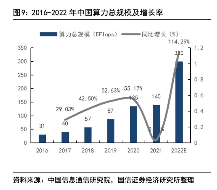 据工信部数据,截至目前,我国AI核心产业规模超过4000亿元,企业数量接近4000家,带动相关产业规模超数万亿元。与此同时,国际数据公司(IDC)等发布的数据显示,2022年我国智能算力规模达到268百亿亿次/秒(EFLOPS),超过通用算力规模;预计未来5年,我国智能算力规模的年复合增长率将达52.3%。