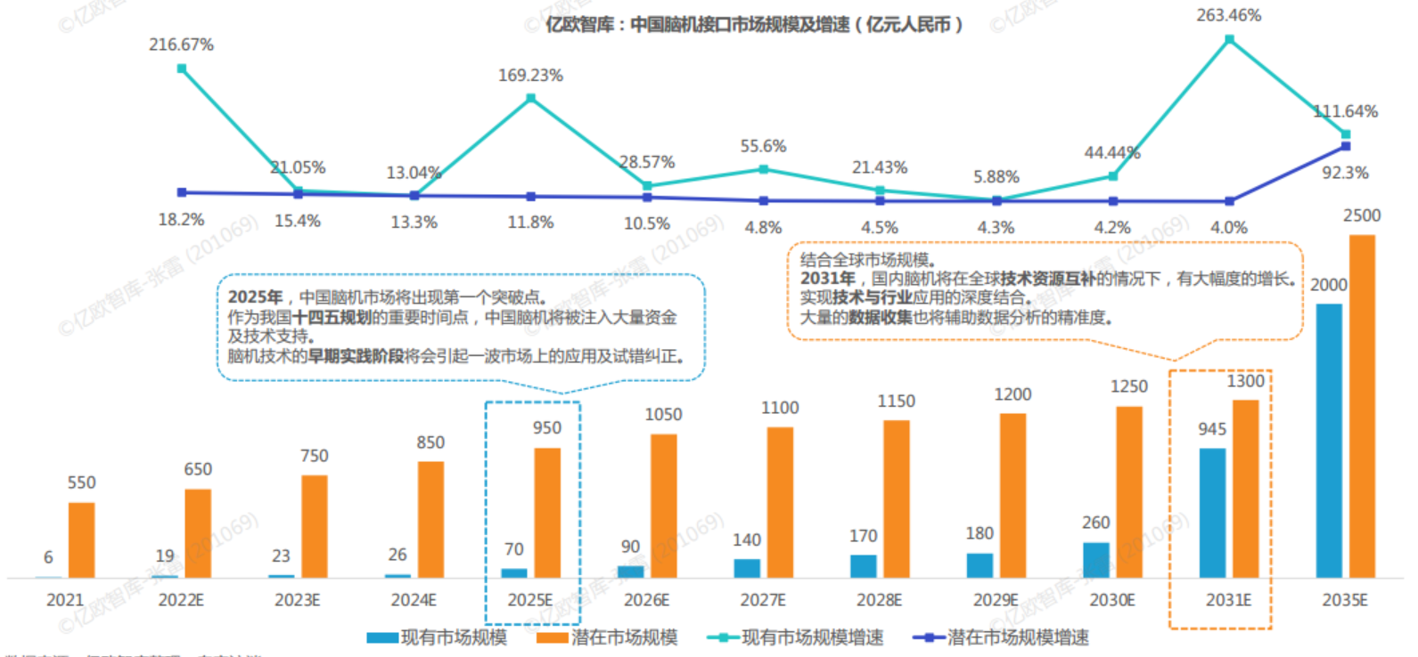 2021年中国脑机接口市场规模约为6亿元,对应潜在需求市场近550亿元。同时,伴随着十四五规划、技术爆发、数字化进程加快等客观条件及因素,该市场在未来十年被持续看好。亿欧智库预测中国脑机接口市场规模将于2031年达到945亿,潜在市场规模也将于届时突破1300亿元。