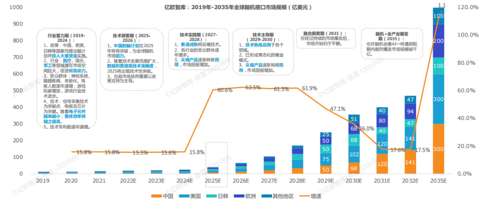 亿欧智库研报中表示,从2019年至2024年,全球脑机市场规模由12亿美元增长至24.9亿美元,复合增长率为15.5%。据预测,2025年,全球脑机市场规模将迎来第1个突破性增长至50亿美元。至2027年,全球脑机接口将实现突破100亿美元市场规模。2031年,全球脑机市场规模将达到450亿美元。直至2035年,全球脑机市场规模将实现千亿级美元市场规模。